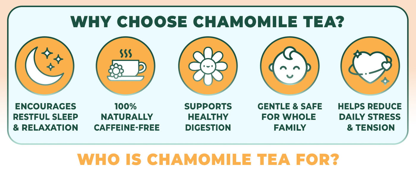 Chamomile tea is known for its calming and relaxing properties. It may help reduce mild anxiety, improve sleep quality, soothe digestion, and boost mood.